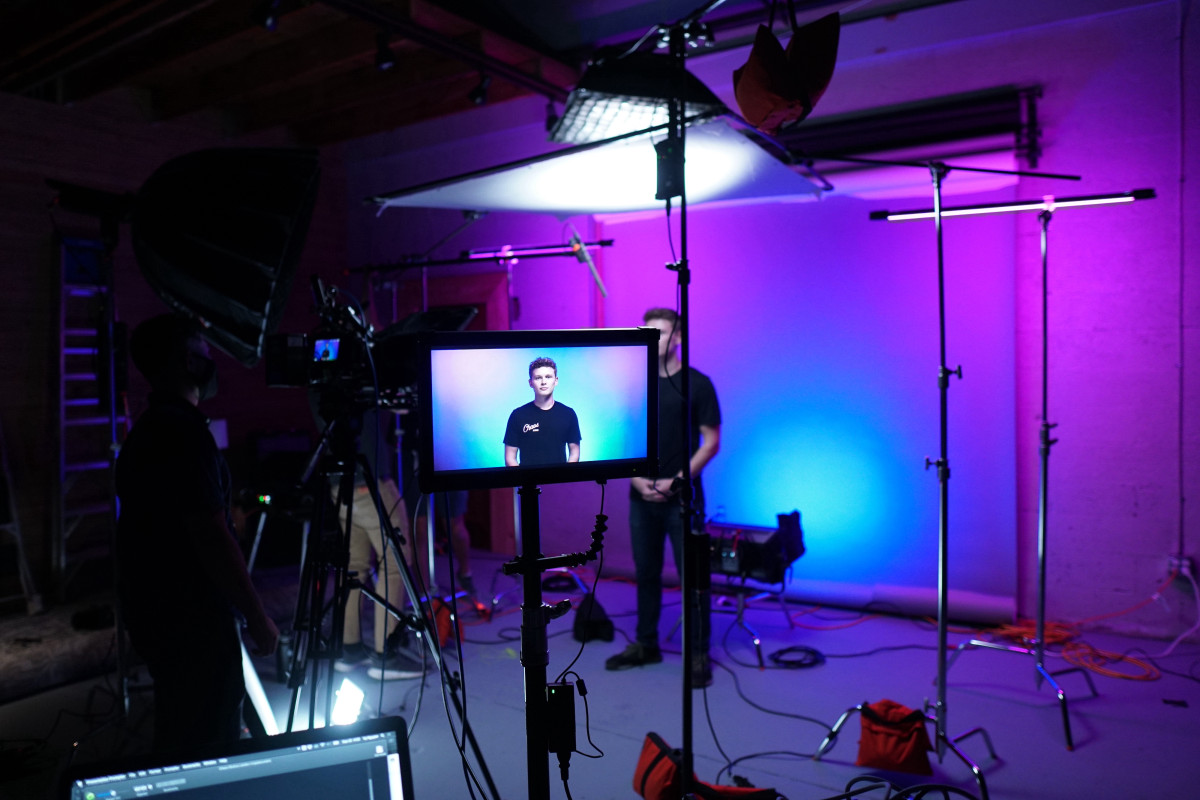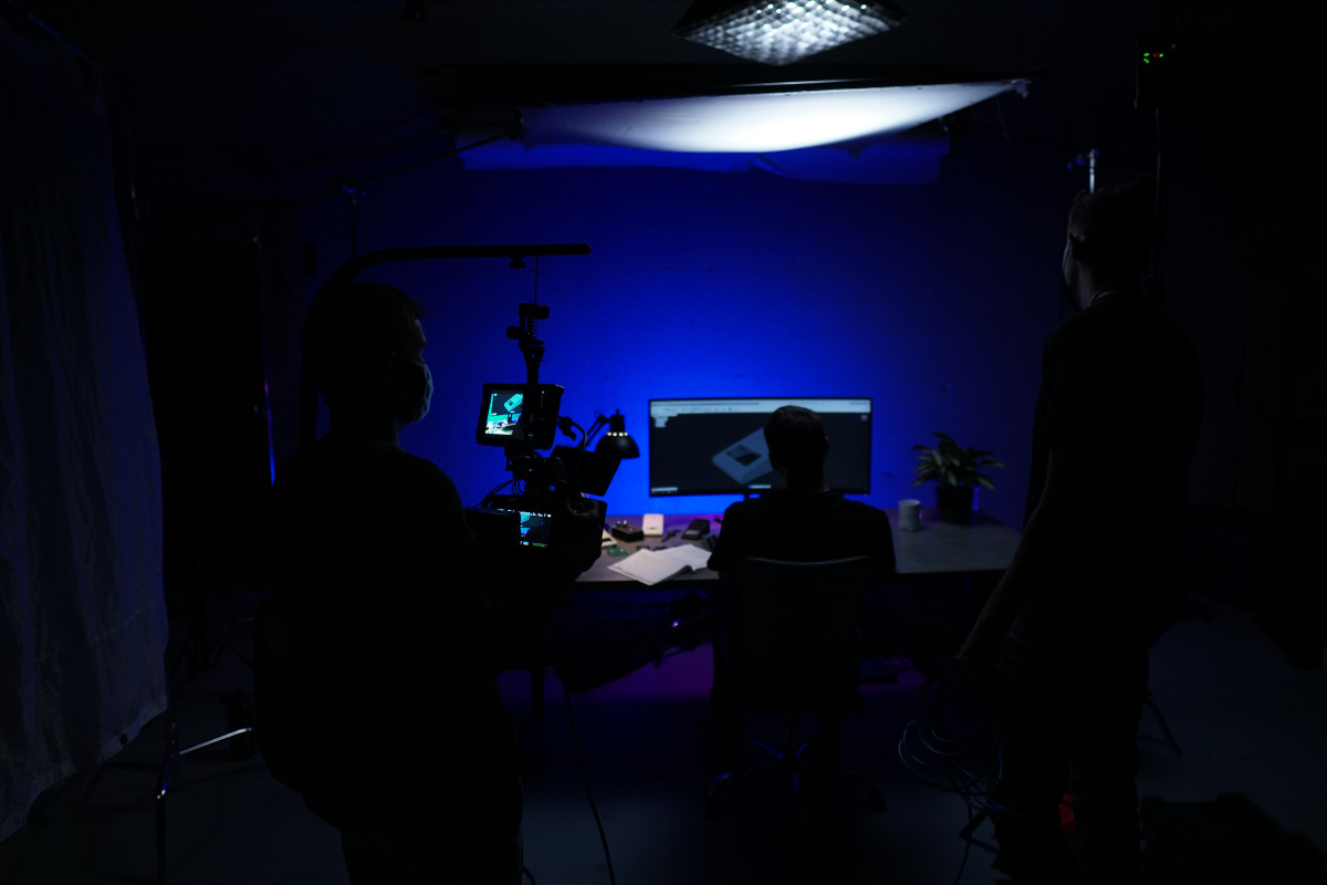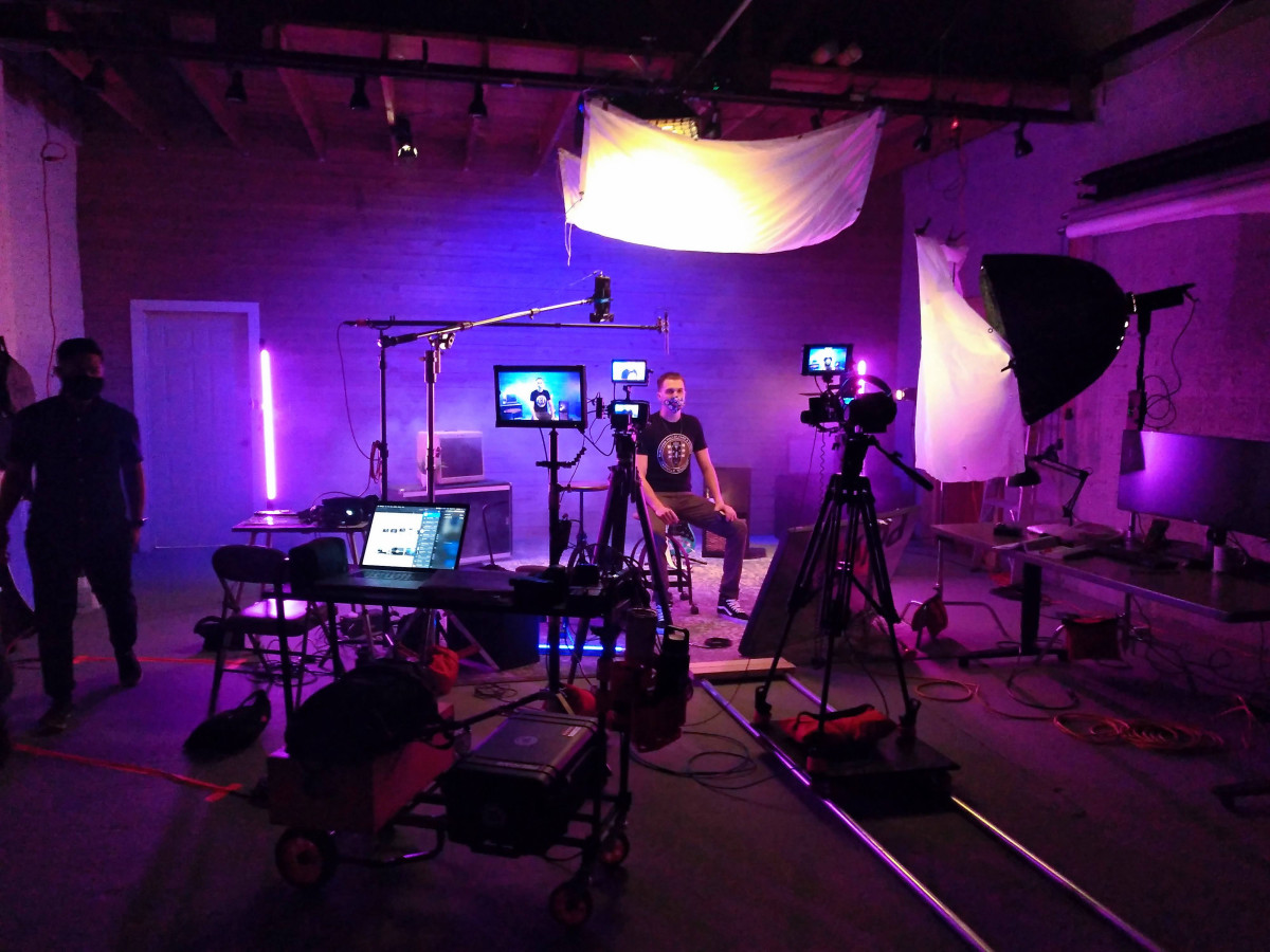 Working within the parameters of Chaos Audio's brand colors, we infused the set with color using our RGB light fixtures. This was the first time we used our Aputure NOVA 300c and we were completely thrilled with its performance. At some point, we mounted this light to the ceiling, so the bluetooth app-enabled controls made it easy to make adjustments throughout the day. That was a game changer.